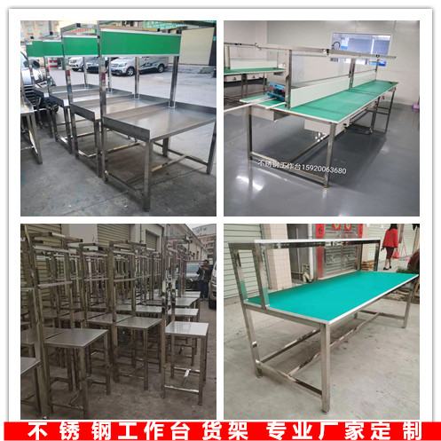 1.支架采用优质40*40mm 201不锈钢(304不锈钢可定制),每台标配带排插1个,配电线,配作业指导书看板,配调节脚,桌脚采用五金配件(五金配件结构简单连接牢固安装快捷等特点),长度,宽度,高度均可以订做。台面承重可达200-300kg