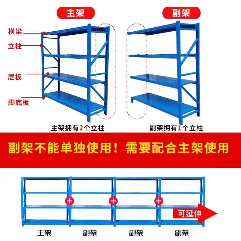 3、层板有木板和钢板可供选择,立柱高度设有每50mm调节孔距,可根据货物高低调节层间使用。